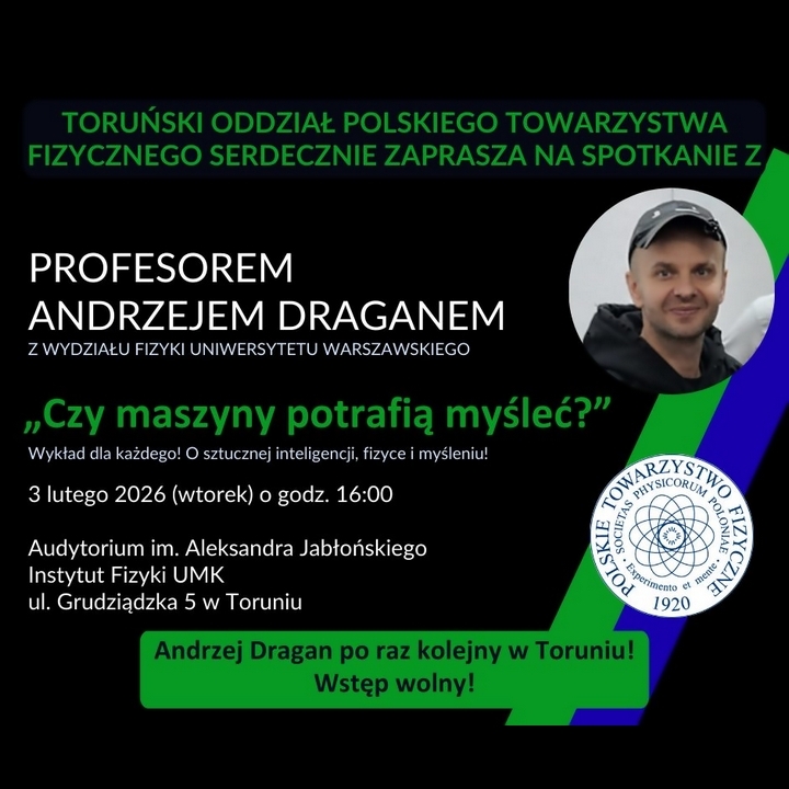 Toruński Oddział Polskiego Towarzystwa Fizycznego zaprasza na spotkanie z prof. Andrzejem Draganem z Wydziału Fizyki Uniwersytetu Warszawskiego pt. "Czy maszyny potrafią myśleć", które odbędzie się w Audytorium Aleksandra Jabłońskiego (s. 26) Instytutu Fizyki UMK w Toruniu przy ul. Grudziądzkiej 5 we wtorek 3 lutego 2026 r. o godz. 16:00.
